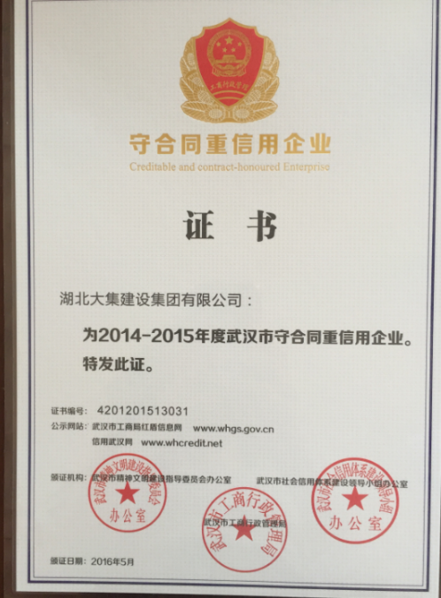 2016年7月21日上午,武漢市工商行政管理局委托蔡甸區(qū)工商管理局領(lǐng)導(dǎo)向湖北大集建設(shè)集團(tuán)有限公司董事長徐濤頒發(fā)2014-2015年度“守合同重信用企業(yè)”榮譽(yù)證書,我公司已連續(xù)十二年榮獲此項(xiàng)殊榮!