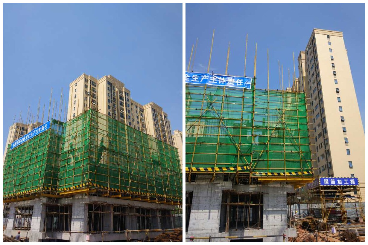 (6月7日,工程管理部檢查結(jié)果:外架采用最新規(guī)范要求,每步架子設(shè)置兩道攔腰桿,間距600,防護(hù)功能更好。)