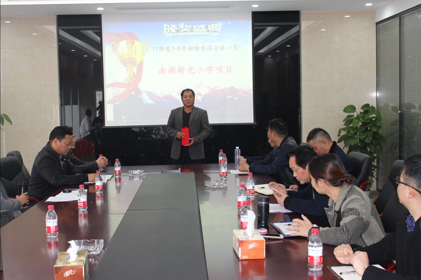 會議開始,由人事行政部公布了上季度績效考評中的冠軍項目——南湖(新光)小學(xué)項目,并由董事長徐濤向冠軍項目頒發(fā)10000元獎金!