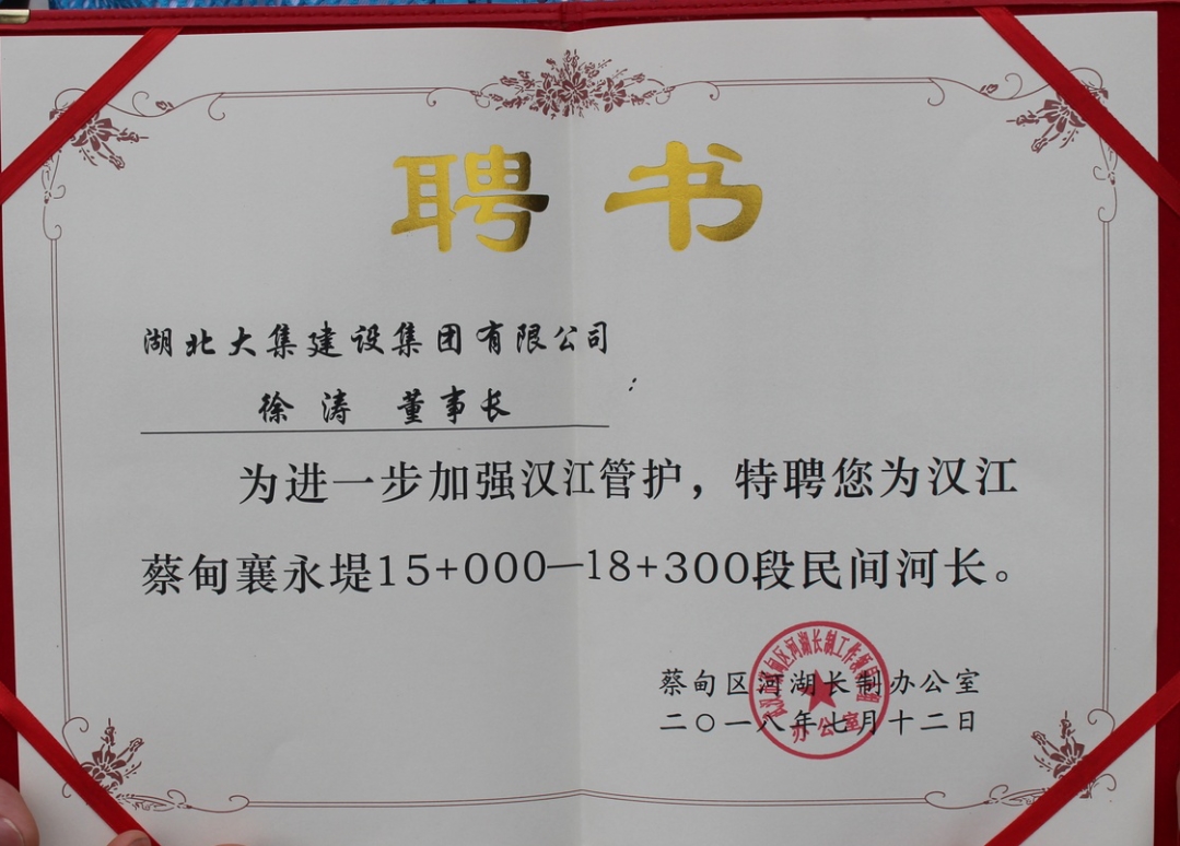 水是生命之源、生產(chǎn)之要、生態(tài)之基。為貫徹落實習近平總書記視察湖北的重要講話精神,進一步加強河湖管理和保護工作,7月12日,蔡甸區(qū)漢江民間(企業(yè))河長履職啟動儀式于蔡甸區(qū)江灘公園隆重舉行,湖北大集建設集團董事長徐濤受聘為漢江蔡甸襄永堤15+000—18+300段民間河長。