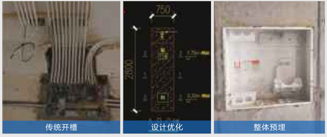 強(qiáng)弱電箱原圖紙?jiān)谄鲶w上開槽后埋線盒子,再進(jìn)行用砂漿修補(bǔ),這樣在工人施工過程中容易鑿斷或者震裂砌墻,后期修補(bǔ)因砂漿過厚也會引起面層開裂。為確保質(zhì)量,經(jīng)過設(shè)計(jì)優(yōu)化,增加構(gòu)造柱預(yù)埋線管及電箱,這樣不但解決開裂問題,加快了施工進(jìn)度,大大消除了質(zhì)量風(fēng)險(xiǎn)。